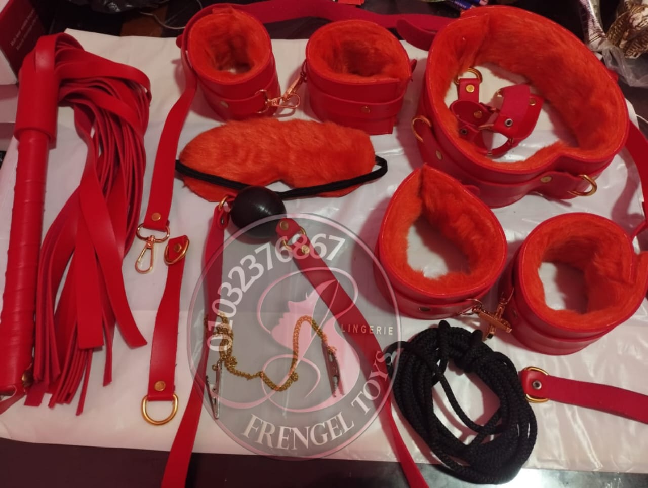 طقم قيود 10 قطع مستورد كوالتي عالي يحتوي علي كلابش ايد ورجل ورقبه وصلتين وصليبه رباعيه للكلابشات وشداد الرقبه وكرباك ومضرب غمامة العين كمامة الفم مشبكة حلمة صدر وحبل تكتيف